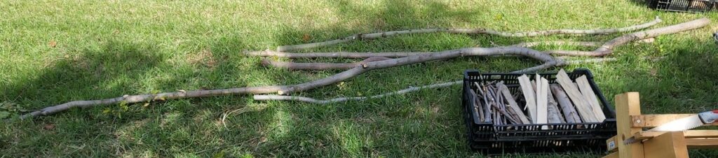 (今回の森づくり活動の成果。写真上部が間伐した木から枝を切落とした木で、右下が出来上がった薪です。)