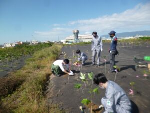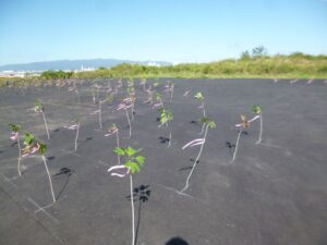植えた苗木の目印としてリボンをつけます。 植えた後の一面です。