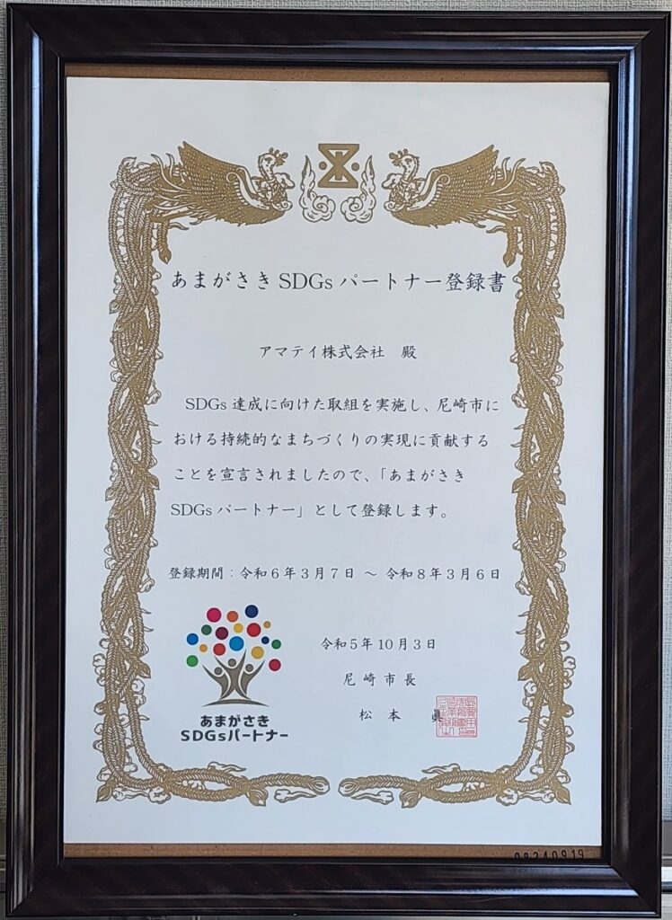 弊社の「あまがさきSDGsパートナー」の登録が更新されました。