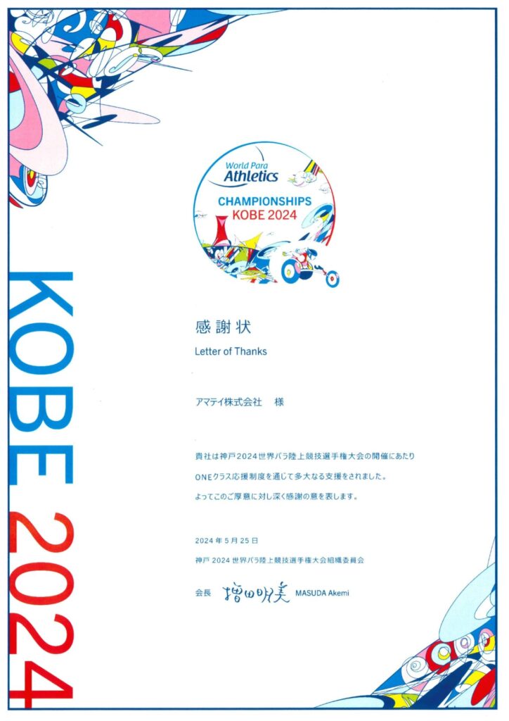 当社は、「神戸2024世界パラ陸上競技選手権大会」の開催にあたり、ONEクラス応援制度を通じた寄付に対し、神戸2024世界パラ陸上競技選手権大会組織委員会より感謝状をいただきました。