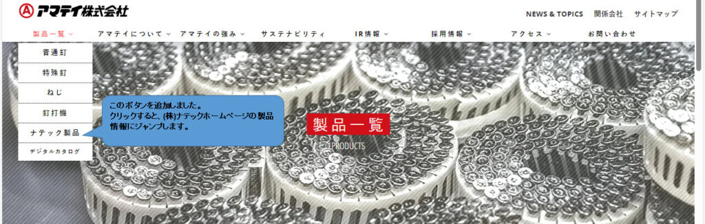 上部メニューの「製品一覧」に「ナテック製品」ボタンを追加し、クリックすると、(株)ナテックホームページの製品情報ページにジャンプします。