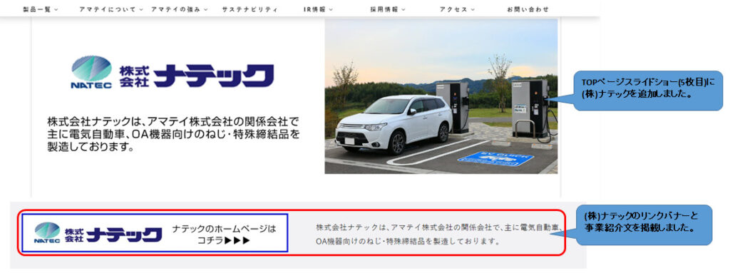 TOPページスライドショー(5枚目)に(株)ナテックのスライドを、スライドショー下に(株)ナテックのリンクバナーと事業紹介文を掲載しました。