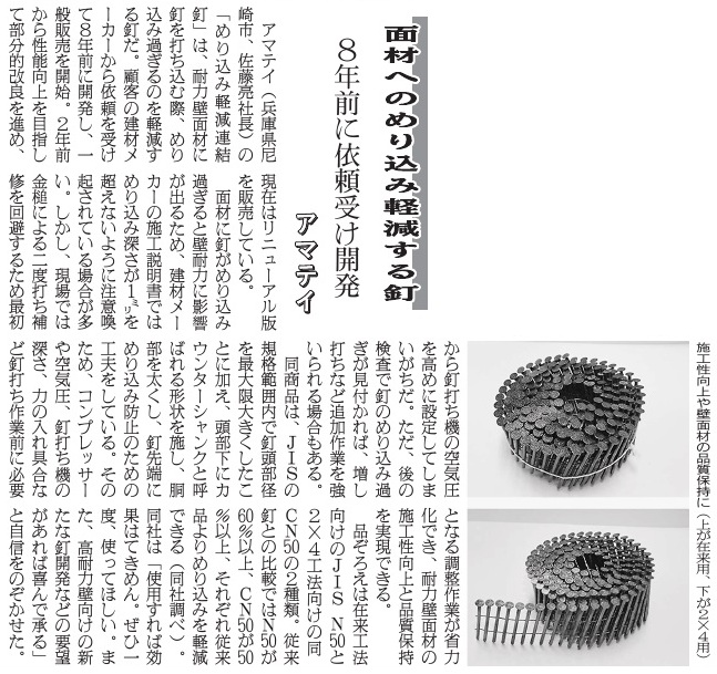 アマテイ株式会社|釘・ネジのアマテイ Amatei|兵庫県尼崎市 > メディア掲載 > 新聞・雑誌 > 「めり込み軽減連結釘」の記事が日刊木材新聞に掲載されました