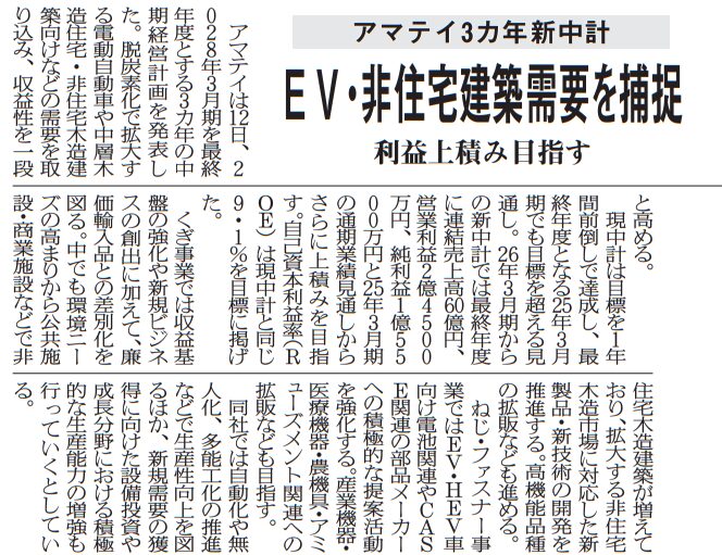(出典)2024年12月13日(金)付日刊産業新聞1面 「アマテイ3カ年新中計 EV・非住宅建築需要を捕捉」