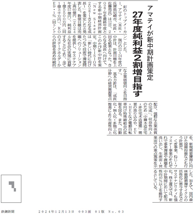 (出典)2024年12月13日(金)付鉄鋼新聞3面 「アマテイが新中期計画策定 27年度純利益2割増目指す」