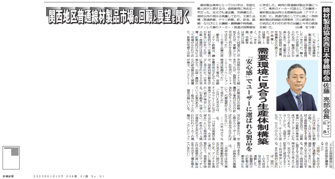(出典)2025年1月15日(水)付鉄鋼新聞8面「関西地区普通線材製品市場の回顧と展望を聞く 線材製品協会西日本普線部会 佐藤 亮部会長(アマテイ社長)」