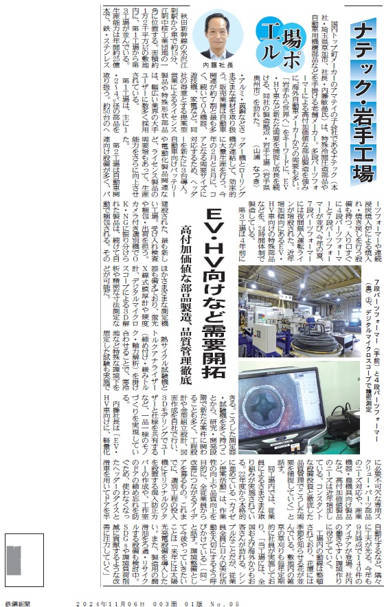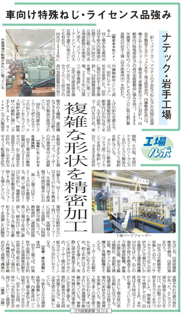 (出典)2024年11月6日(水)付日刊産業新聞2面 「ナテック・岩手工場 工場ルポ」
