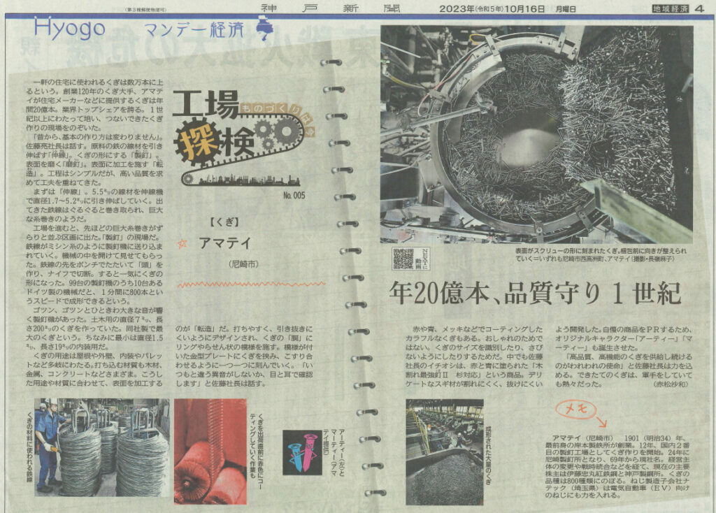 アマテイ株式会社|釘・ネジのアマテイ Amatei|兵庫県尼崎市 > メディア掲載 > 新聞・雑誌 > 2023年10月16日(月)付『神戸新聞「工場探検」』に弊社の記事が掲載されました